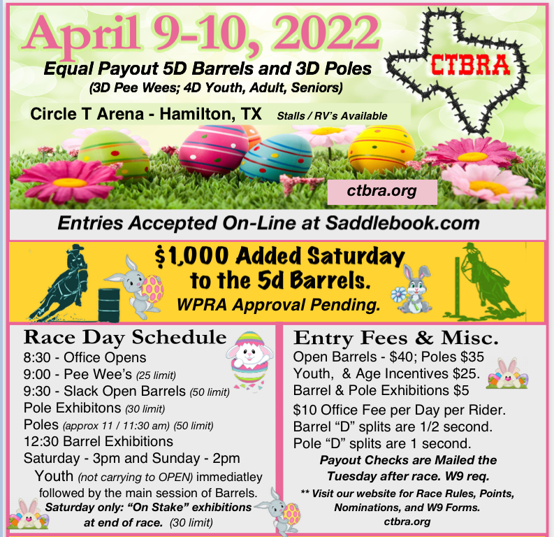 Apr 9 to Apr 10 CTBRA Sat, Apr 9, 2022 9:00 AM 09:00 Sun, Apr 10, 2022 9:00 AM 09:00 Circle T Arena (map) Google Calendar ICS View Event →